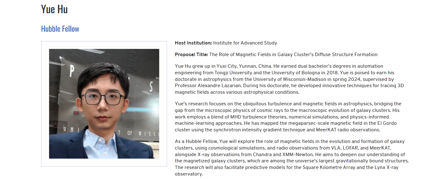 NHFP是美国天文学界最负盛名的博士后荣誉,获奖者可在美国自由选择合作单位从事博士后研究,由美国宇航局提供全额工资和研究经费。作为一名哈勃学者,胡越将前往普林斯顿高等研究院和加州理工学院开展关于“磁场在星系团形成中的作用”的研究。(获奖者介绍详见://www.stsci.edu/stsci-research/fellowships/nasa-hubble-fellowship-program/2024-nhfp-fellows)