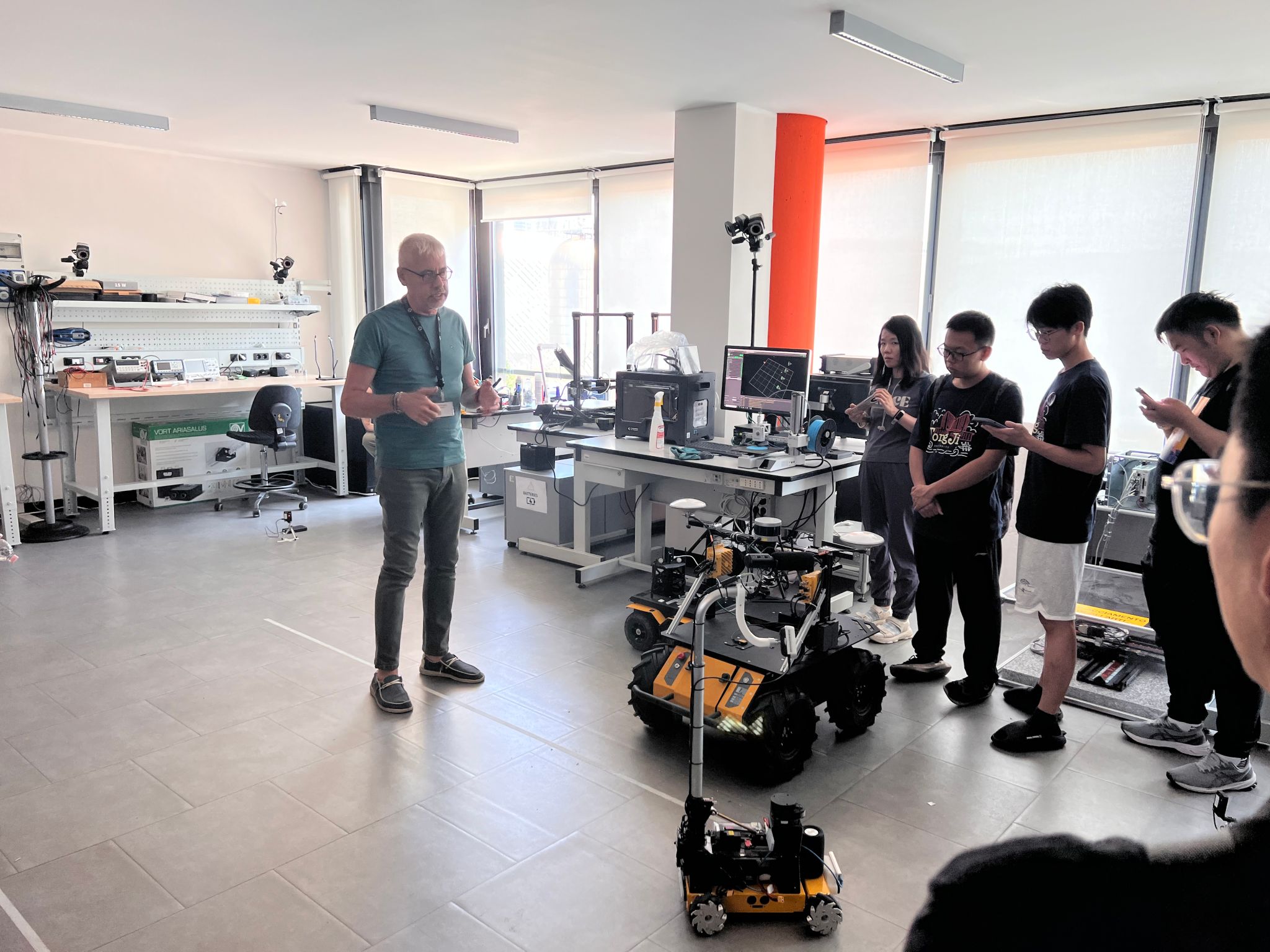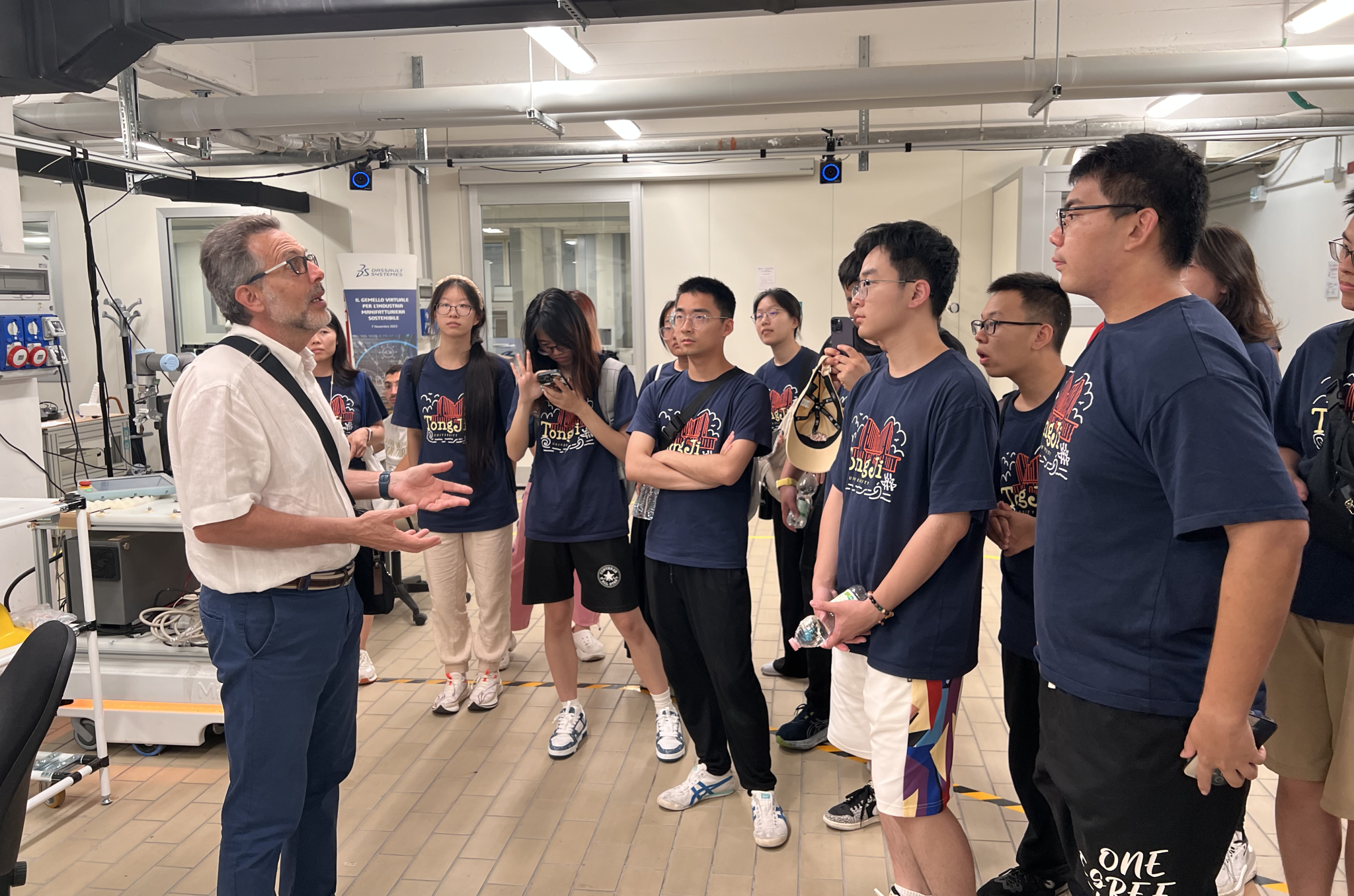 师生代表团随后来到都灵理工大学进行为期3天的学习交流活动。在2006年,我校开始与都灵理工大学合作开展本科双学位POLITONG项目。都灵理工大学在电子信息领域具有深厚的研究基础,拥有数十位IEEE Fellow。都灵理工大学电子与通信系的系主任Prof. Gianluca Piccinini以及Prof. Fabrizio Bonani向师生代表团展示了他们在电子与通信领域的最新研究成果。此次参观涵盖了电子与电信系(Department of Electronics and Telecommunications, DET)的四个核心实验室,包括微纳电子系统实验室(Micro&Nano Electronic Systems Lab)、电子硬件实验室(Microelectronics HW Lab)、“Pierluigi Civera”实验室以及微波电子实验室(Microwave Electronics Lab)。此外,都灵理工大学还特别安排参观了三个面向成果转化落地应用的实验室和中心,分别包括Mind4Lab(制造业工业实验室)、PhotoNext(光子技术跨学科中心)和Pic4Ser(服务机器人跨学科中心)。这些实验室和中心致力于推动智能制造、光子技术和服务机器人领域的创新和发展,为工业5.0时代的到来提供强有力的技术支持。