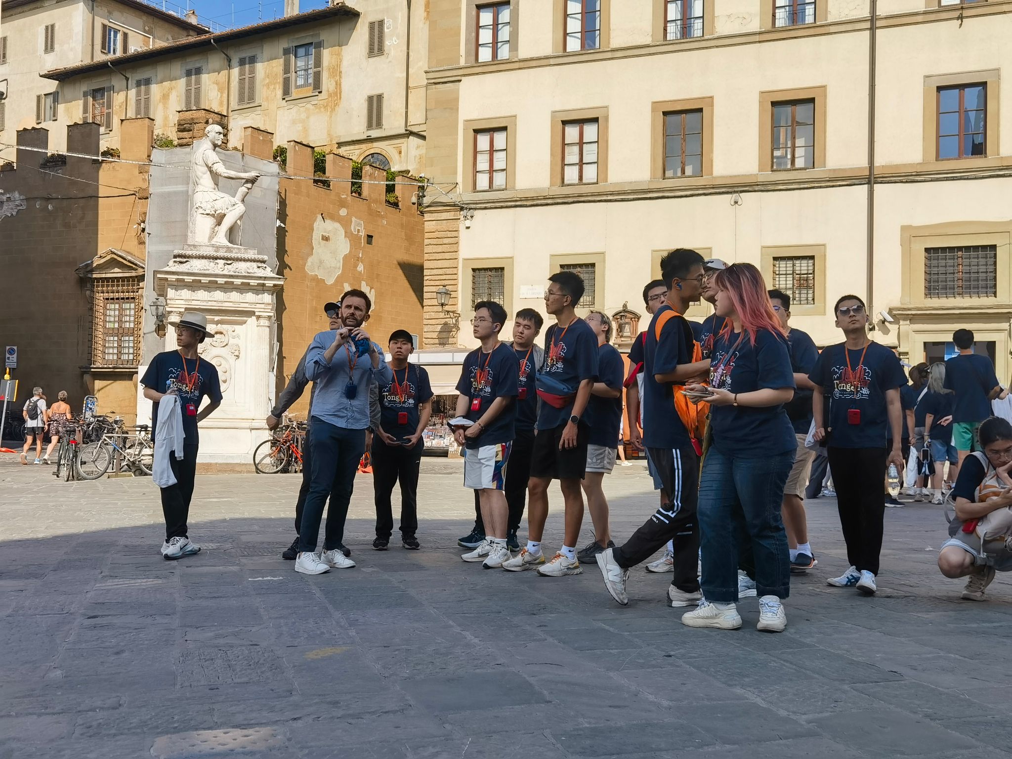 在佛罗伦萨,师生代表团跟随着意大利向导进行了一场别开生面的city walk。穿行在佛罗伦萨的街道,师生代表团体验了一场美妙的历史与艺术之旅。一路上建筑古迹庄严宏伟,让人印象深刻。在这里,大家体会到了建筑艺术的力量,它不仅仅是供人欣赏的美丽外壳,更是历史、文化和智慧的结晶。此外,在佛罗伦萨大学教授的带领下,同学们分批进入乌菲齐美术馆观摩学习,乌菲齐美术馆位于阿尔诺河畔,收藏了大量珍贵的文艺复兴时期艺术品。通过两位老师的讲解,同学们不仅欣赏到了这些伟大画作的艺术之美,还深入了解了文艺复兴时期的历史背景,跟随艺术家们对人类自身、自然与世界文明进行深刻思考。