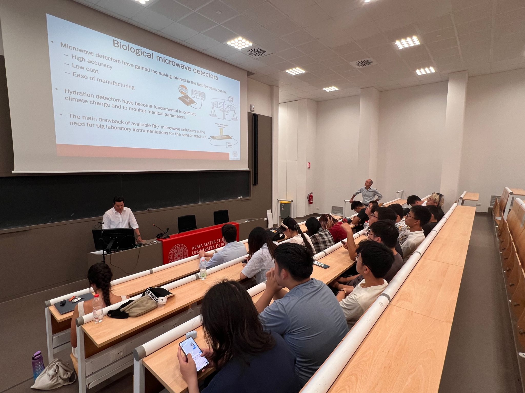 本次学习交流的最后一站来到博洛尼亚。在2007年,我校开始与博洛尼亚大学签署合作协议,开展本科双学位ALMATONG项目。博洛尼亚大学是世界第一所大学,无线电之父“马可尼”在博洛尼亚大学实验室发明了无线电通信装置。师生代表团本次访问的电气、电子和信息工程系(Department of Electrical, Electronic, and Information Engineering , DEI)在通信技术、信号处理和信息技术领域享有盛誉。该系致力于推动无线通信、光通信、网络安全和物联网等领域的前沿研究,培养能够应对现代通信挑战的高素质工程人才。首先,博洛尼亚大学自动化工程专业的Prof. Giuseppe Notarstefano及其研究团队向师生代表团展示了他们在机器人领域的最新研究成果。讲座后的参观涵盖了博洛尼亚大学自动化工程专业的多个实验室,分别展示了该专业在自动控制和系统工程方面的前沿研究和应用,包括路径规划、环境感知等方面的技术。接着,由来自博洛尼亚大学电信工程专业的Prof. Diego Masotti及其研究团队向师生代表团展示了他们在无线通信领域的最新研究成果。在随后的参观中,Prof. Diego Masotti团队带领师生代表团参观光纤通信实验室、路由交换实验中心以及智能天线设计中心。