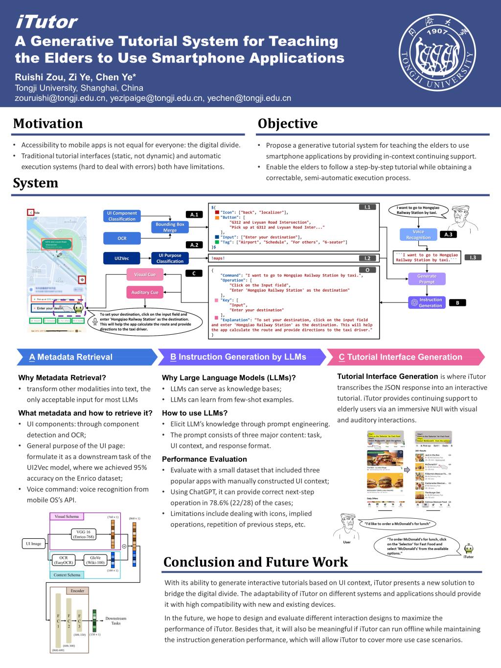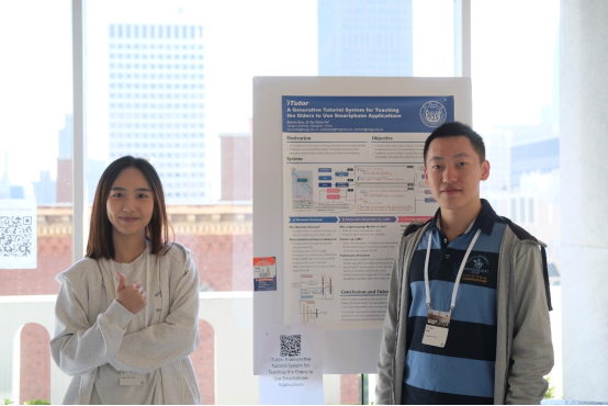 两名同学以“iTutor: A Generative Tutorial System for Teaching the Elders to Use Smartphone Applications”为题进行了海报交流。其中,邹睿石、叶梓分别为第一、第二作者,酷18