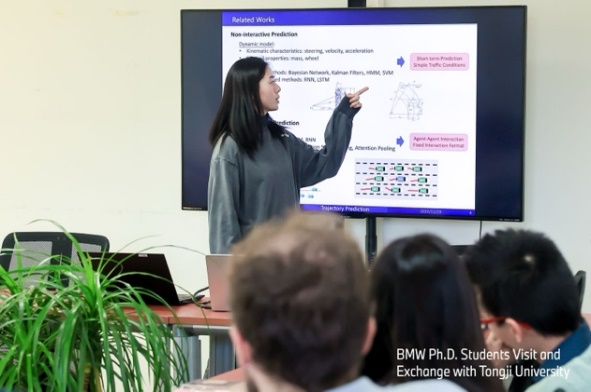 当日上午,宝马集团博士生团队首先参观了智能汽车实验室,张琳教授团队围绕智能动力系统、V2X与组合定位、感知与决策、运动规划与控制、测试与评价这五个研究方向进行了介绍。