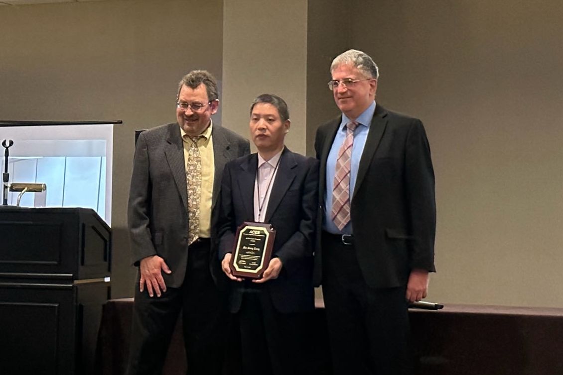 电子科学与技术系童美松教授受邀参加在美国佛罗里达州奥兰多市举办的“2024Applied Computational Electromagnetics Society Symposium”年会,在颁奖晚宴上他获得了该学会的最高奖“Technical Achievement Award”,以表彰他在应用计算电磁学领域做出的杰出贡献。学会现任主席、美国佐治亚理工大学的Andrew F. Peterson教授和上一任主席、美国科罗拉多州立大学的Branislav M. Notaros教授共同亲自为童美松教授颁奖,随后童美松教授受邀发表获奖致辞。会议期间童美松教授还被邀请做了一场题为“NontraditionalNumerical Methods for Solving Electromagnetic Problems”的Keynote(主旨)报告,受到了与会专家的广泛好评,事后有多位国际著名教授请求与童美松教授建立长期的交流与合作关系。