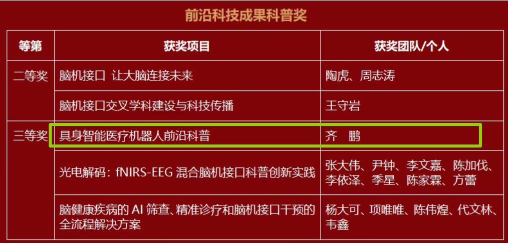 医疗机器人实验室负责人齐鹏副教授申报的“具身智能医疗机器人前沿科普”项目,成功荣获首次设立的“前沿科技成果科普奖”个人三等奖,这标志着酷18