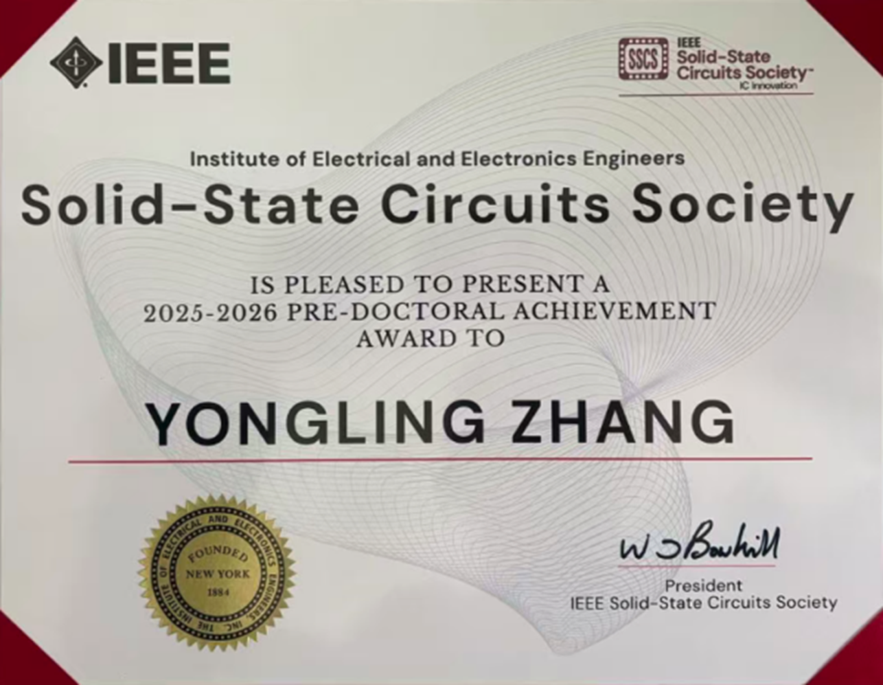 博士生张永领凭借在低功耗射频集成电路设计领域的突出学术成果与创新贡献,被IEEE SSCS(固态电路学会)授予2025-2026年度SSCS Predoctoral Achievement Award(国际固态电路学会博士生成就奖)。