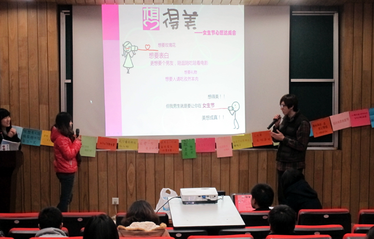 女生节是社会上广为流传的自创节日,是女生们为了区别于三八妇女节才有的。表达的是年轻一代女生的诉求。区别于已经工作成家的女性,这次女生节的心愿,显得单纯而可爱,有些甚至是有些搞怪。也透着一些小女生不想长大的私心。在高校办女生节,既是让平时忙于学习的大学生有结交新朋友的机会,也丰富了学生社区的生活。(张 璇)