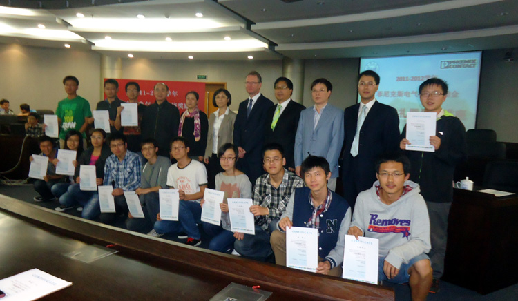 设立了奖励金,并成立了菲尼克斯实验室,鼓励师生们致力于专业研究;Roland Bent在发言中对于双方的合作给予高度肯定,并对获奖师生表示祝贺;获奖师生代表也表示对菲尼克斯电气集团的感谢,并表示在今后的工作学习中将积极进取,不断取得新的成就,同时不忘回报社会、奉献爱心。Bent先生和在座各位嘉宾为获奖师生进行颁奖并且合影留念。