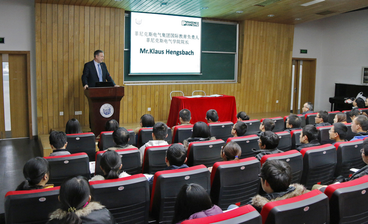 117报告厅举行,菲尼克斯电气中国公司副总裁杜品圣博士、菲尼克斯电气集团国际教育负责人、菲尼克斯电气学院院长Mr.Klaus Hengsbach、菲尼克斯电气中国公司酷18与社会责任经理易书波、菲尼克期电气中国公司ICE销售部上海地区行业销售经理稽鹏,及酷18