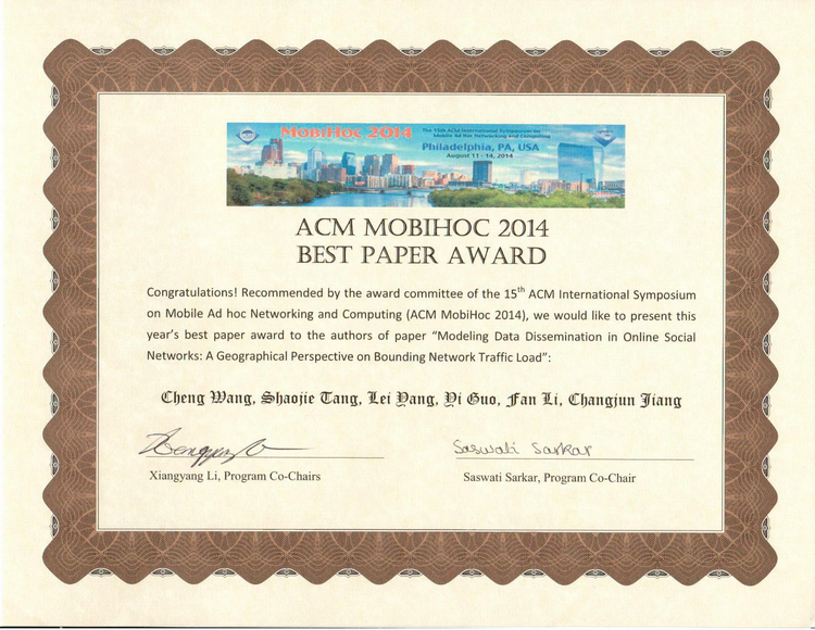 近日,在美国费城召开的第15届国际学术会议ACM MobiHo上,智能感知网高等研究院王成研究员等完成的论文:《在线社交网络数据分发建模:从地理分布角度界定网络流量负载》(Modeling Data Dissemination in Online Social Networks: A Geographical Perspective on Bounding Network Traffic Load)获得了会议颁发的最佳论文奖(Best Paper Award)。