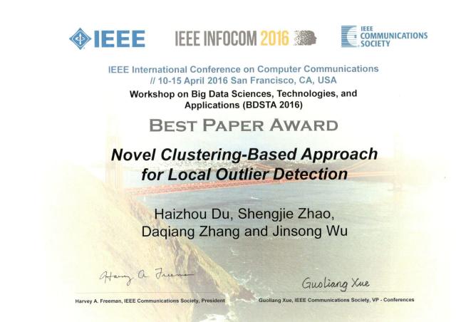 赵生捷教授的论文《基于聚类的新颖局部离群点检测方法》 (Novel Clustering-based Approach for Local Outlier Detection)获得了会议颁发的大数据科学、技术与应用workshop最佳论文奖(Best Paper Award for workshop on Big Data Sciences,Technologies,and Applications BDSTA 2016)。