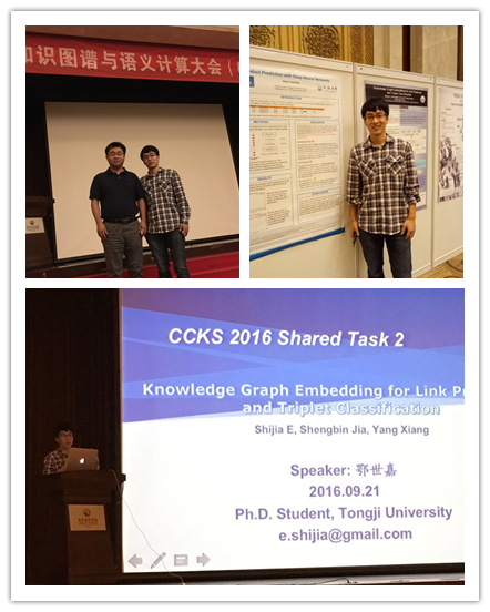 党委副书记向阳教授及博士研究生鄂世嘉参加了在北京举行的全国知识图谱与语义计算大会(CCKS 2016),向阳教授实验室团队在大会全部三项知识图谱评测竞赛中的两项——产品预测和知识图谱链接预测分别取得了总成绩第一名和第二名的优异成绩,并在会上对相关成果进行了汇报。