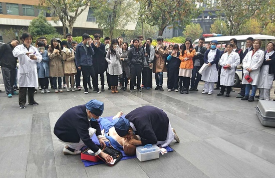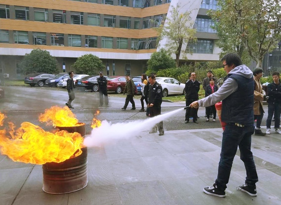 报告结束后,在陈启军院长的宣布下,消防应急疏散与自救互救演练正式开始。火情警报拉响后,师生们纷纷用毛巾捂住口鼻,快速逃离烟雾区。紧急疏散后,校医院的医生为师生们进行了心肺复苏等紧急救援措施的讲解与现场演示。最后,贾晓航老师向大家示范了干粉灭火器的使用方法,并指导师生们进行灭火演练。