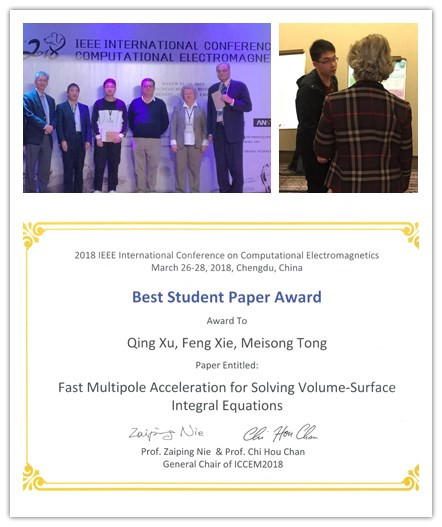 电子科学与技术系2017级硕士研究生徐卿受邀参加在成都举办的国际著名学术会议“2018 IEEE International Conference on Computational Electromagnetics (2018年IEEE计算电磁学国际会议)”,他在专门设置的“Competition for the Best Papers of Students(学生最佳论文竞赛)”分会场作了题为“Fast Multipole Acceleration for Solving Volume-Surface Integral Equations(求解体–面积分方程的快速多极子加速方法)”的海报展示,受到竞赛评委和观众的好评,事后被多位国际著名教授誉为“interesting work”及“excellent job”。
