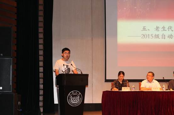 老生代表2015级常恒同学结合自身的大学生活经验,叮嘱新生在大学生活中养成好习惯,学会自主学习,并希望学弟学妹尽快完成大学生身份的转变,常恒学长提醒同学们,大家拥有了自己决定自己未来的权力。同时也肩负起了自己成长的责任。