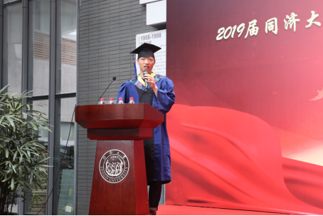 随后,毕业生代表上台发言。带着对母校及昔日同窗真挚的情感,毕业生代表王晖分享了临别时的心情。他回顾了同济过去三年的点滴变化,以及自己不断变强,三年的刻苦努力,也最终成为了他直面社会的助力。他感恩学校和老师们的悉心培育和鼓励支持,最后以发自内心的朴实话语表达了对母校、对学院、对老师和同学们的美好祝愿。