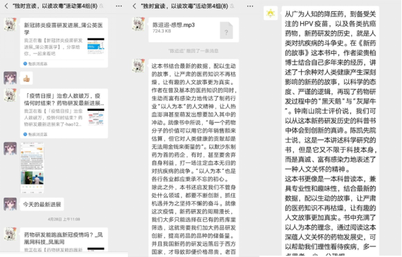 在党员同学的组织和带领下,“独时宜读,以读攻毒”读书活动第四小组的同学们在微信群内分享阅读进度和心得体会,查找与疫情和新药的故事相关的材料,分享自己的感悟与收获。
