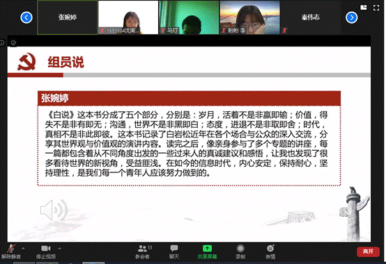 2020年5月19日下午,电气信通联合党总支在Zoom平台开展了“独时宜读,以读攻毒”系列读书活动第五期——《白说》读书分享会。
