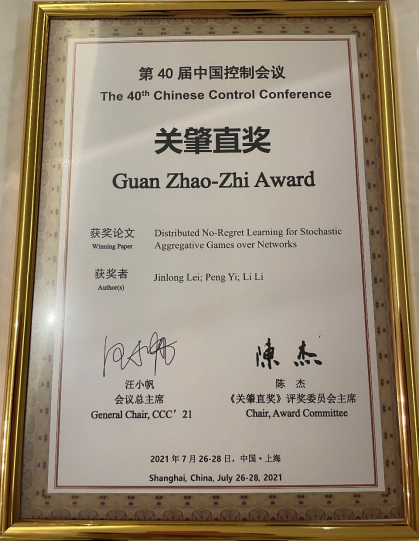 控制科学与工程系青年教师雷金龙研究员与衣鹏研究员、李莉教授合作的论文“Distributed No-Regret Learning for Stochastic Aggregative Games over Networks”在上海松江举办的第40届中国控制会议(The40th Chinese Control Conference, CCC2021)中荣获第27届“关肇直奖”。