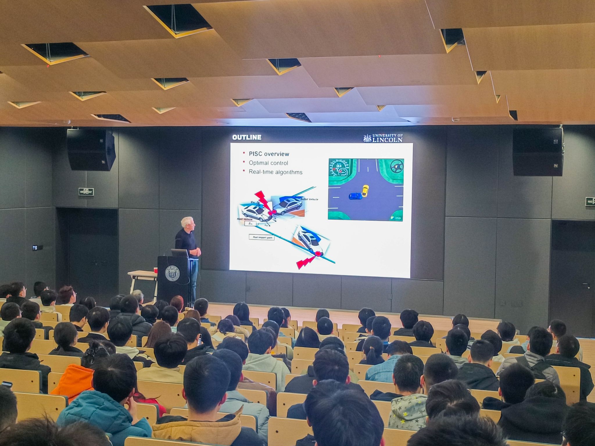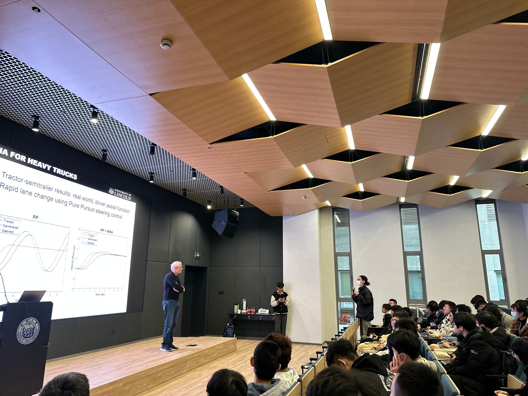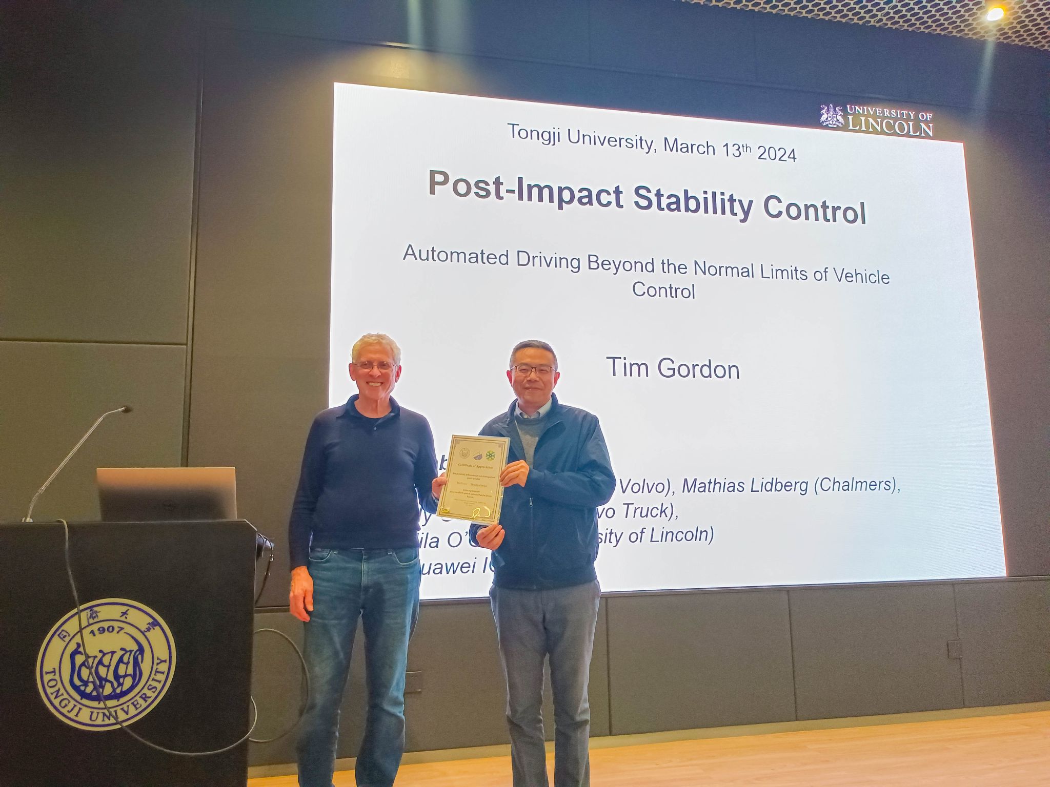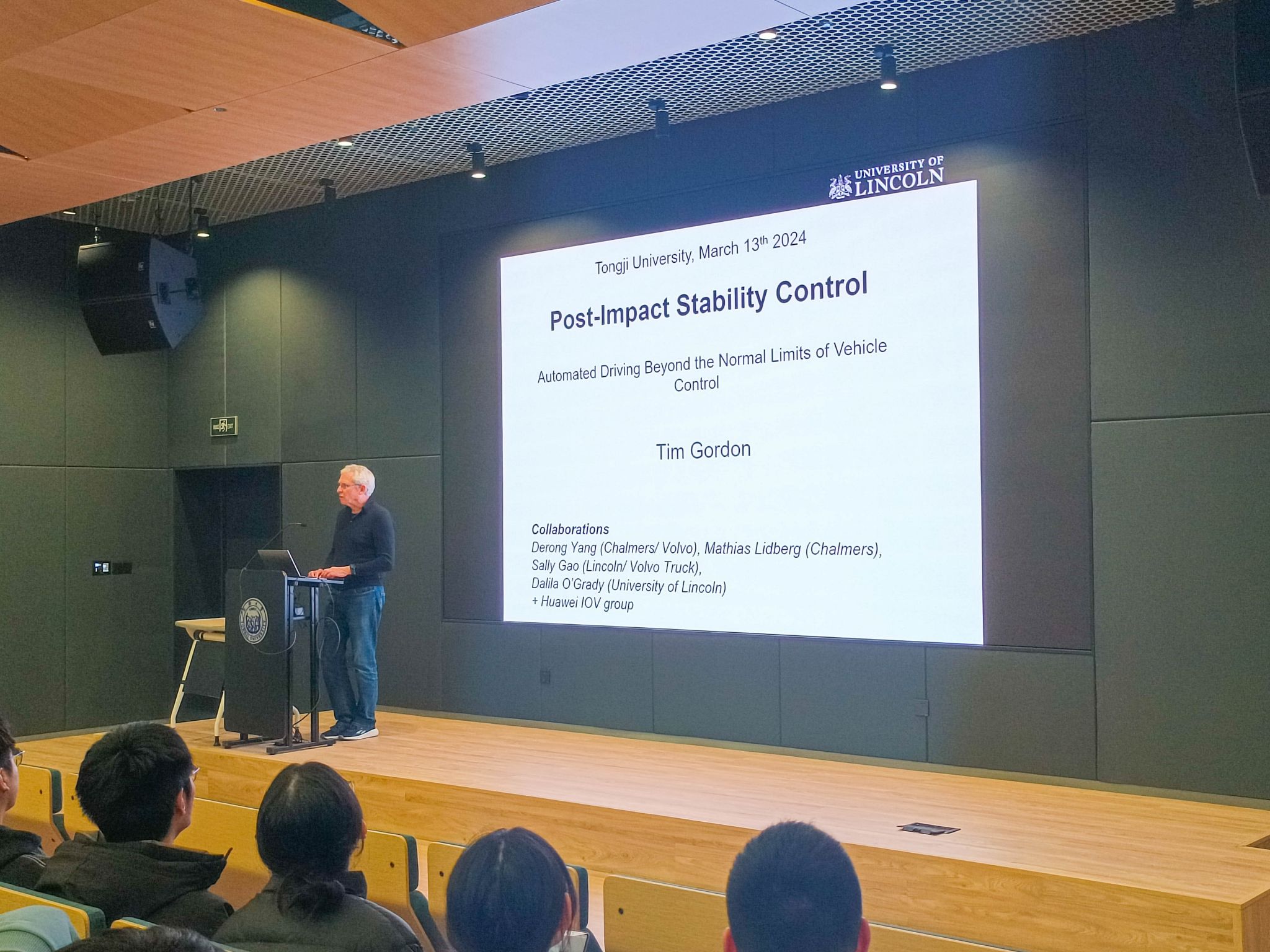 智信馆117报告厅开讲。本次讲堂邀请英国林肯大学Timothy Gordon教授作“Post-Impact Stability Control-automated driving beyond the normal limits of vehicle control”主题报告,由陈虹教授主持。