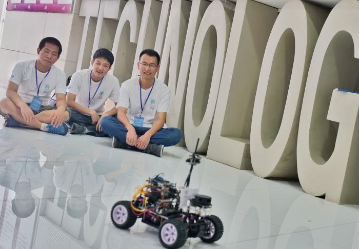 获得一等奖的刘炀、王建亮、王仁为三名同学分别来自信息安全、动化与电气工程专业,在创新基地叶晨老师的指导下,经过近四个月的摸索和研究,开发了一款基于机器视觉和SLAM的室内自主巡逻预警机器人。该系统利用激光雷达采集的数据和SLAM算法构建陌生空间的二维地图,借助AMCL算法和局部路径规划算法,实现在室内空间中的定位和避障,从而完成自主移动和巡逻功能。同时,机器人搭载了三个鱼眼摄像头,通过对图像进行畸变矫正和单应性变换得到机器人周围地面的鸟瞰图,再结合当前的位置信息将鸟瞰图和轮廓进行整合,最终得到包含细节的室内地图。在巡逻过程中,机器人将对周边环境进行实时比对和分析,当发现可疑静止物体时通过无线网络向安保人员进行报警。安保人员也可在必要的情况下通过操作手柄,远程遥控机器人至指定位置进一步查看或采取相应的处理措施。(叶晨)