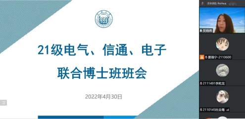 4月30日,学院2021级电气、信通、电子联合博士班召开了线上班会。学院党委组织员吴晓燕老师、联合博士班班主任蔚瑞华老师及班级全体博士生参加了本次班会。