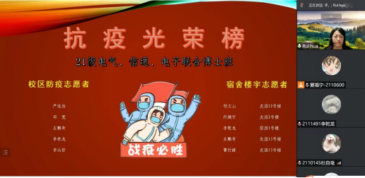 最后,班主任蔚瑞华老师充分肯定了大家在疫情期间共克时艰、遵守和配合学校疫情防控工作的表现,并表扬了在校园封闭管理期间参与校区防控和宿舍楼宇志愿服务的同学,并关心询问了班级中密接、次密接学生现状。蔚老师和同学们分享了一位百岁老人的通透之悟,勉励同学们响应学校号召、配合防疫政策,调整心态,全力以赴打赢这场疫情防控阻击战。(文/图 夏福宁)