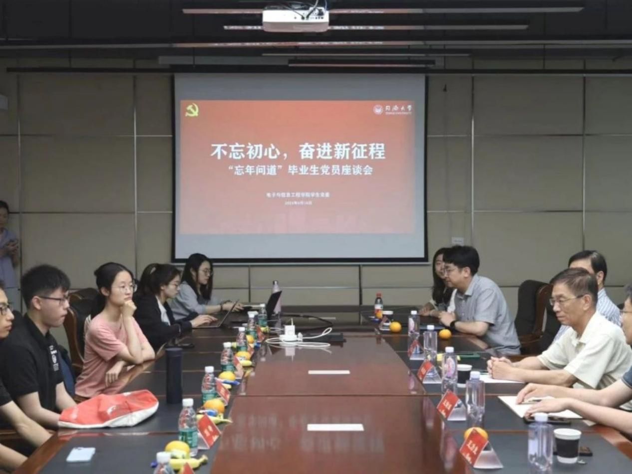 为进一步引导毕业生党员心怀“国之大者”,坚定理想信念,6月18日下午,学院学生党委开展以“不忘初心,奋进新征程”为主题的“忘年问道”毕业生党员座谈会。校关工委常务副主任、原副校长金正基,校关工委常务组乔建新,电信学院党委副书记王瀚漓,学院关工委常务副主任王力生、委员胡宗福及2024届毕业生党员代表出席座谈会。会议由学院党委副书记徐伟铖主持。