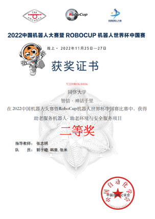 助老服务机器人比赛分为两个不同组别:助老生活服务和助老环境与安全服务,主要考察机器人的人机交互能力、机械设计能力、SLAM以及自主导航能力、机械臂自主操作能力、语音定位功能、环境状态监测等任务的完成。由控制系张志明老师指导的两支队伍顺利完成总决赛,最终双双获得全国二等奖。智信·雁浦渔歌队参加助老生活服务项目(第五名),队员为刘泳希(通信工程)、杨鸿银(电子信息工程)、张方杰(自动化)、邬致远(人工智能)、刘昊(控制科学与工程);智信·神话千里队参加助老环境与安全服务项目(第六名),队员为郭子瞻(自动化)、韩意(自动化)、张米(电气工程)。