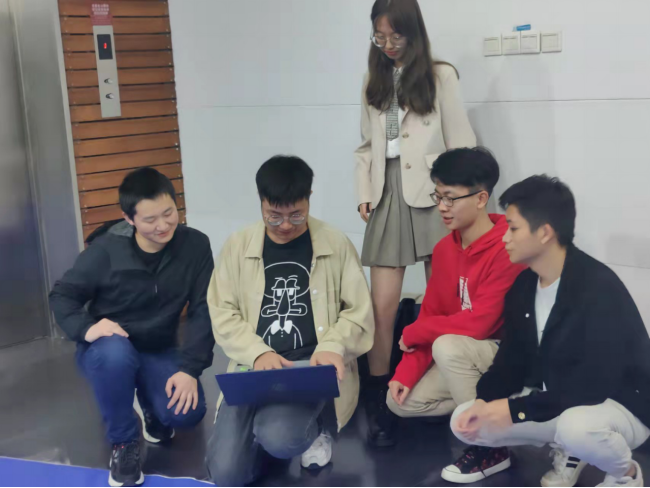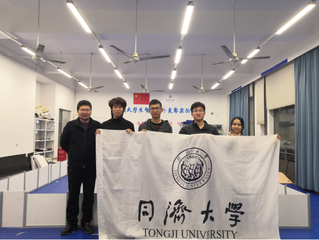 智能机器人分拣挑战赛参赛师生合影(从左到右:张志明、王聪聪、刘一凡、韩子奇、梁伊雯)