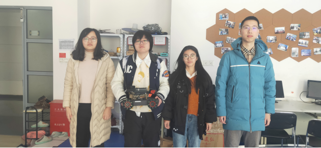 医院智能引导机器人参赛队员合影(从左到右:孙景怡、侯哲、黄媛媛、刘政钦)