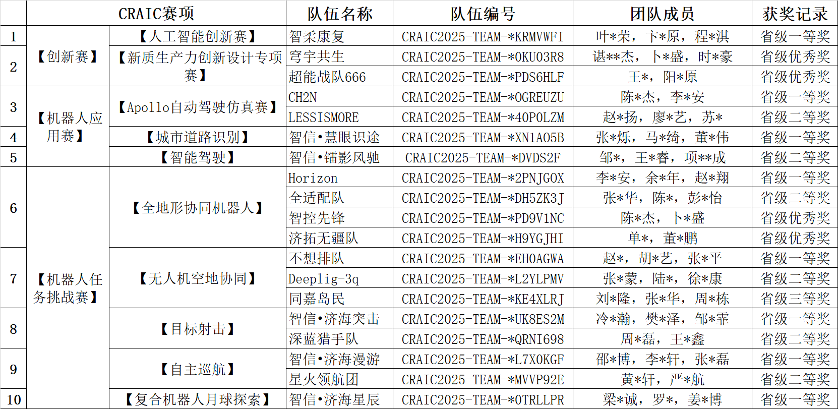 获奖队伍名单